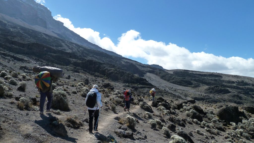 The day begins with a steeper climb as you leave the rainforest behind and enter the moorland zone. The landscape opens up, offering stunning views of the mountain and surrounding valleys. The trail is rocky, with giant heathers and volcanic rock formations. After about 4 to 6 hours, you’ll arrive at Shira Camp, located on a high plateau. This is a great place to witness Kilimanjaro’s majestic peak as the sun sets.